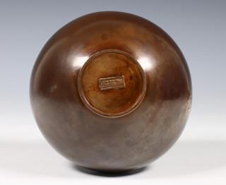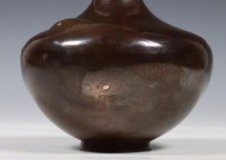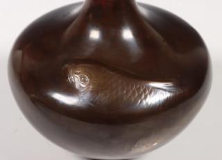 Japan, brown patinated bronze bottle vase with relief decoration of carp, Meiji period, the carp's eyes inlaid in silver and gold, signed to the base
