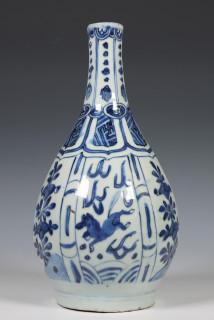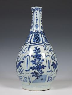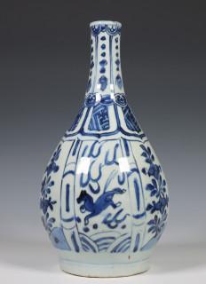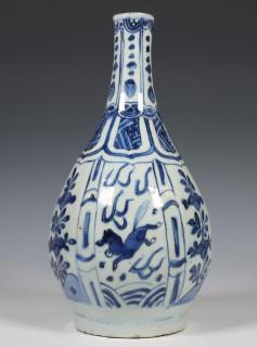 China, blue and white 'kraak' porcelain bottle vase, Wanli, the pear-shaped body decorated with panels of flying horses and flowers, provenance: Dutch private collection