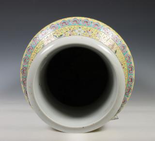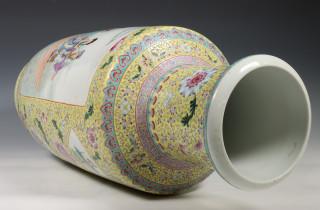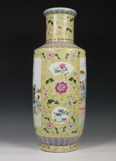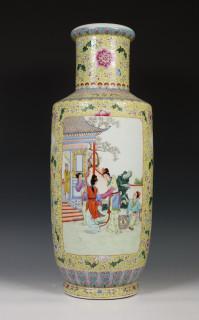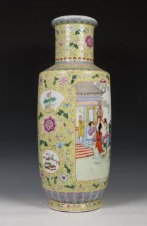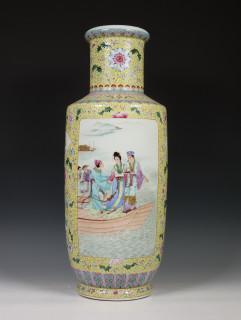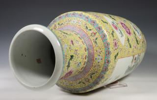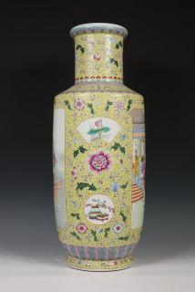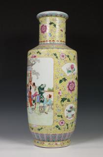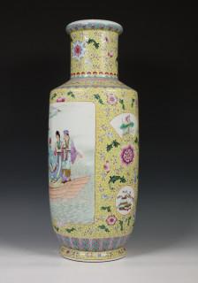China, famille rose porcelain baluster vase, 20th century, decorated with figural panels on a yellow ground embellished with flowers, with apocryphal Qianlong mark, provenance: Dutch private collection