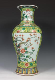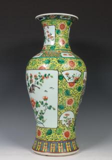 China, famille rose porcelain yellow-ground baluster vase, 20th century, decorated with panels of birds, prunus and peony, on a yellow ground with flower scroll, provenance: Dutch private collection