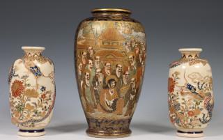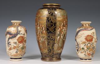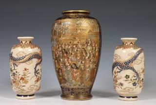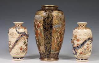 beide gemodelleerd met draak tussen chrysanten, samen met een Satsuma vaas beschilderd met figuren (haarlijnen)