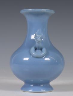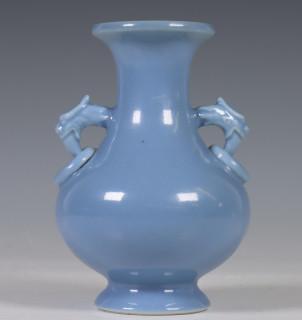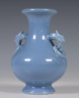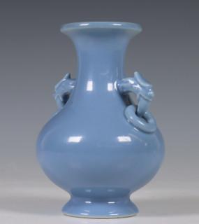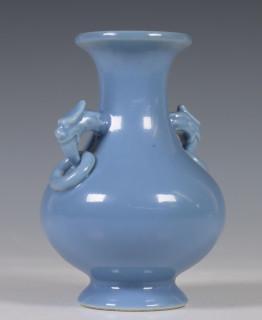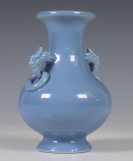 China, blue-glazed porcelain vase, 20th century, covered with a lavendar glaze, with two dragon and ring handles, with apocryphal Yongzheng mark, provenance: Dutch private collection