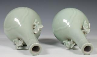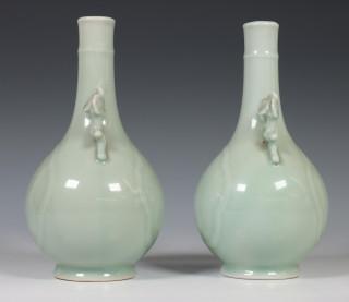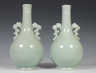 China, pair of celadon porcelain vases, 20th century, the pear-shaped vases with two prunus-shaped handles, covered with a soft green glaze, provenance: Dutch private collection