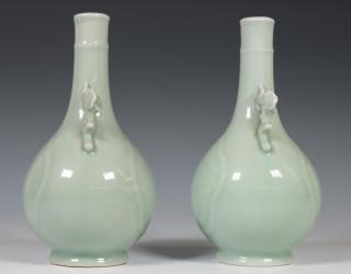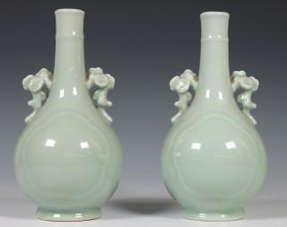 de peervormige vazen met twee prunusvormige grepen, bedekt met een zachtgroen glazuur