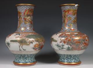 Japan, pair of Satsuma porcelain vases, 19th/20th century, decorated with a pair of peacocks in a flower garden (one with chip, cracks), provenance: Dutch private collection