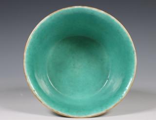 China, famille rose porcelain bowl, 19th century, decorated to the exterior with a dignitary and his entourage near a mahout and his elephant, the interior and base covered with a turquoise glaze, with Daoguang seal mark, provenance: Dutch private collection