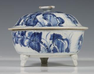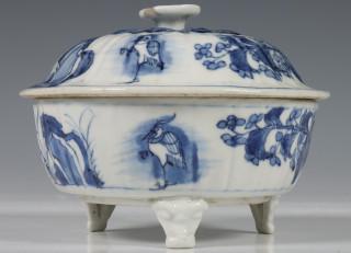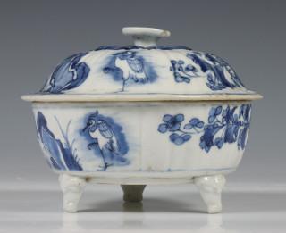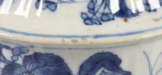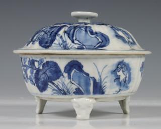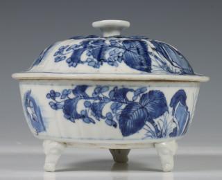 China, blue and white porcelain ribbed bowl and cover, Kangxi, raised on three feet, decorated with flowering plants and cranes (cover with chips), provenance: Dutch private collection