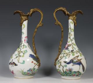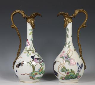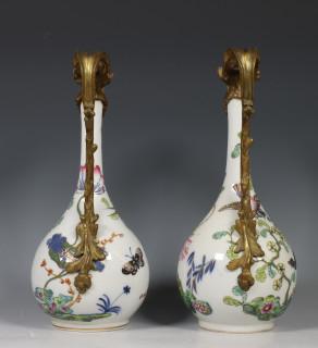 Paar famille rose porseleinen vazen met bronzen monturen, 20e eeuw,