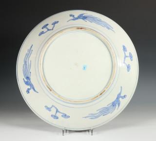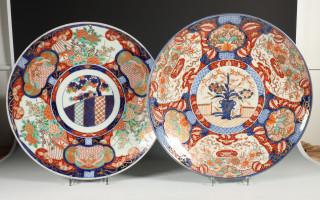Japan, three Imari porcelain chargers, Meiji period, each variously decorated with flowers, stylised phoenix and fo-dogs (one with chip to standring), provenance: Dutch private collection