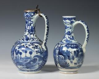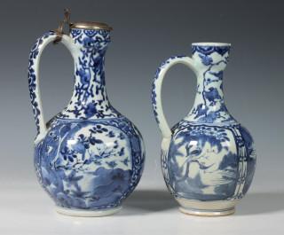 Japan, two blue and white porcelain jugs, Edo period, late 17th century, variously decorated in the Chinese Transitional style with figural panels and stylised flowers, one mounted with metal cover (cracks, small chips), provenance: Dutch private collection