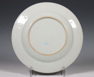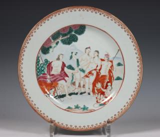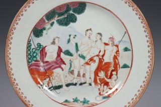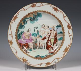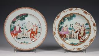 Judgment of Paris' plates, Qianlong, each decorated with Paris offering an apple to Aphrodite while Athena and Hera look on, one plate with rocaille border, the other with spearheads (one with small chip), provenance: Dutch private collection