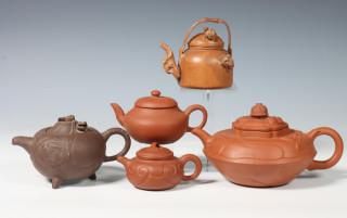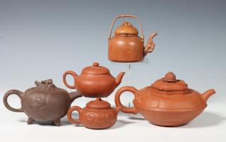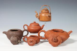 bestaande uit een theepot gemodelleerd met bladeren, een met draken, een met ruyi en een glad Yixing theepotje, het houten potje gesneden met krekels (enkele beschadigingen)