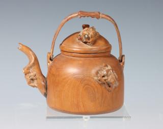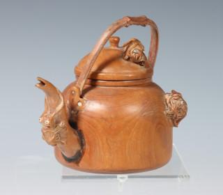 China, four Yixing earthenware and a wooden teapot, Qing dynasty and later, comprising a teapot modelled with leaves, one with dragons, one with ruyi and a plain Yixing teapot, the wooden pot carved with crickets (some damage), provenance: Dutch private collection