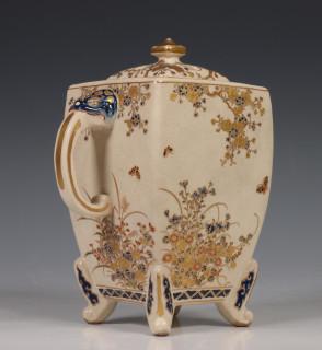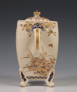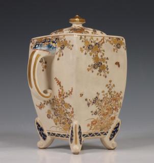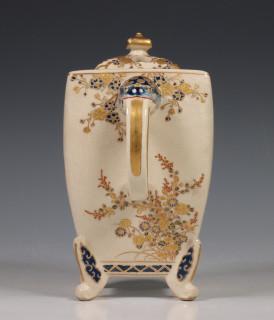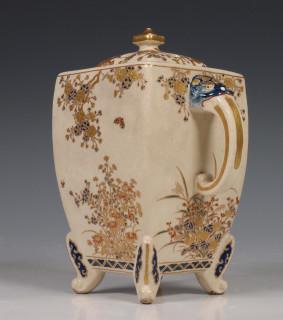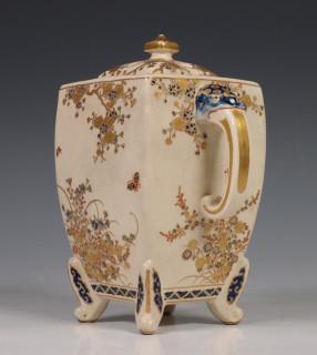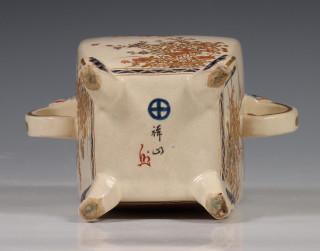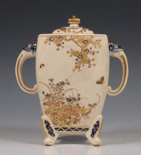 Japan, Satsuma porcelain censer, 19th/20th century, rectangular, raised on four feet and with two lion's head handles, delicately decorated with flowers, with openworked cover, provenance: Dutch private collection