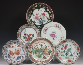 China, zeven Imari, famille verte en famille rose porseleinen borden, 18e eeuw en later,