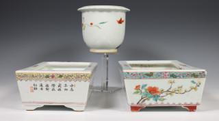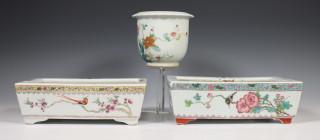 China, two famille rose porcelain jardinières, 20th century, each rectangular and decorated with birds and flowers, with apocryphal Qianlong mark, together with a circular jardinière with cranes, provenance: Dutch private collection