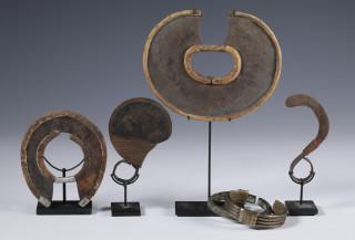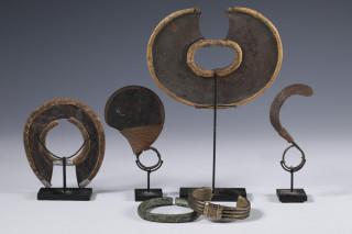 Kenya, two iron fist knives, two finger knives and two copper alloy bracelets