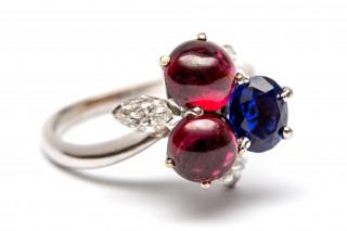 de kop in de vorm van een klavertje, bezet met cabochon geslepen granaten, gefacetteerde synthetische saffier en drie markies geslepen diamanten, totaal ca. 0,45ct. (VSI/SI / kleur H)