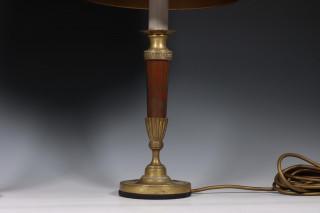 Hierbij een gepatineerd koperen schemerlamp met bruin gelakte metalen kap.