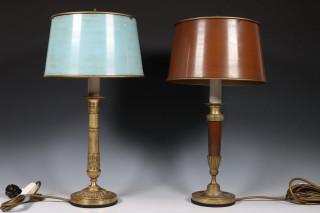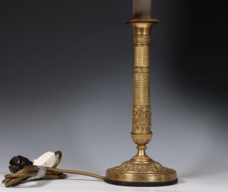 Koperen schemerlamp met blauw gelakte metalen kap, 19e/20e eeuw.