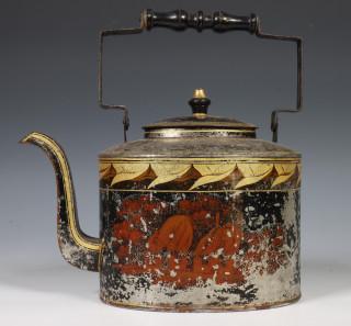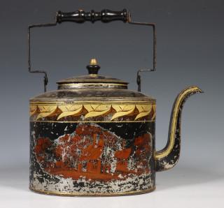 Schuitvormige voet met geschilderde scenes van landschappen met figuren en huizen. Compleet met vijf losse bobeches. Hierbij een tôle peinte theeketel. (beschadigingen).