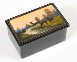 Met geschilderde voorstelling van romantisch gezelschap. Hierbij een papier-maché snuifdoosje met geschilderde voorstelling van herten in landschap. (waaier beschadigd).