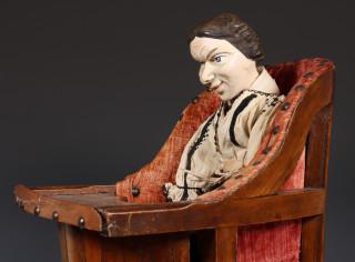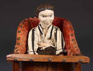 Duitsland, papier-maché karakterpop in poppenstoel, 19e eeuw.