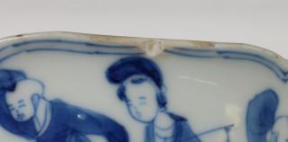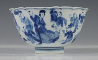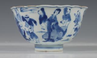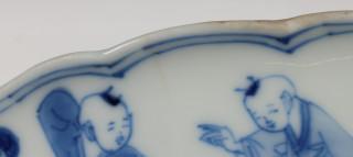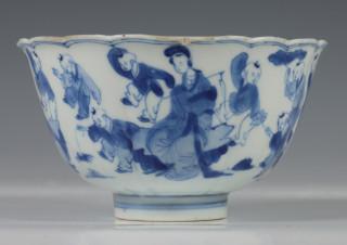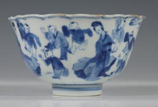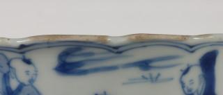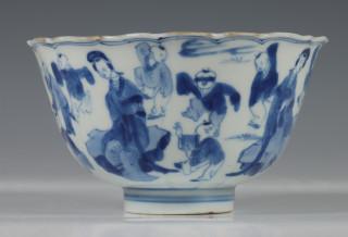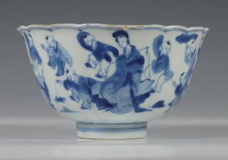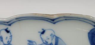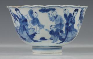 China, blue and white porcelain sculpted bowl, Kangxi, decorated with elegant ladies and boys at play, with six-character mark (small chip and crack), provenance: Dutch private collection