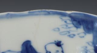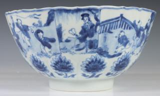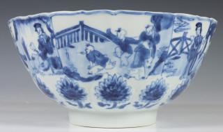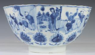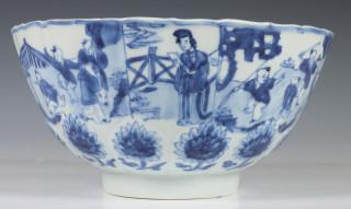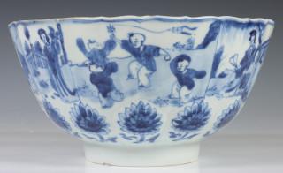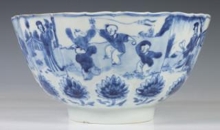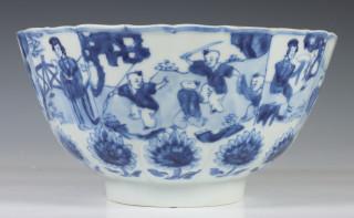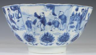 China, blue and white porcelain moulded bowl, Kangxi, moulded with floral panels and decorated with boys at play and elegant ladies, the base with six-characeter ' Qi yu bao ding zhi zhen' mark (some frits, rim crack, rim polished), provenance: Dutch private collection