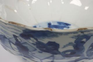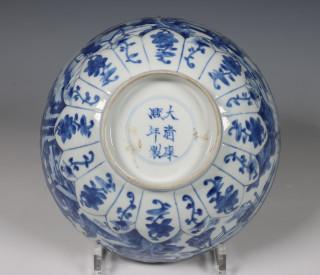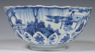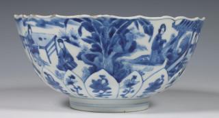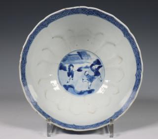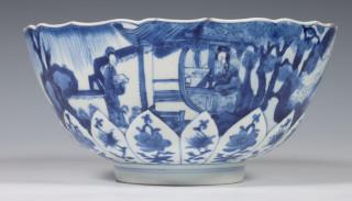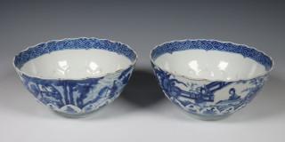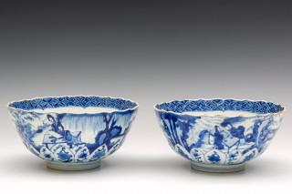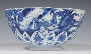 China, pair of blue and white porcelain moulded bowls, Kangxi mark and period, each modelled with floral panels, decorated with elegant ladies practising qin and playing weiqi, the base with six-character Kangxi mark in underglaze blue (some frits and minute chips), provenance: Dutch private collection