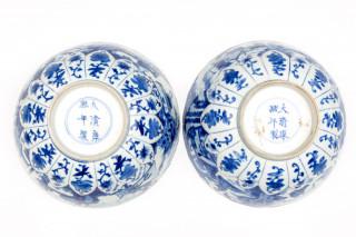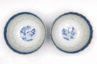 China, paar blauw-wit porseleinen gemodelleerde kommen, Kangxi merk en periode,
