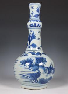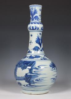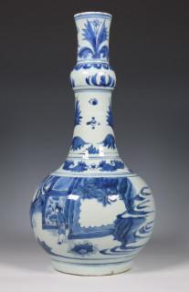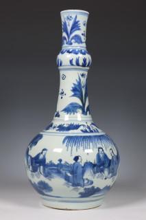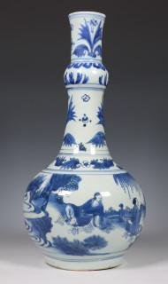 China, blue and white porcelain Transitional bottle vase, mid 17th century, decorated with scholars seated in a fenced garden, the neck with stylised tulips (frits, small chips, scratches), provenance: Dutch private collection