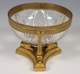 Uitgevoerd met geslepen kristallen schaal welke wordt gedragen door drie dolfijnen. Geheel op driekantige vergulde basis.