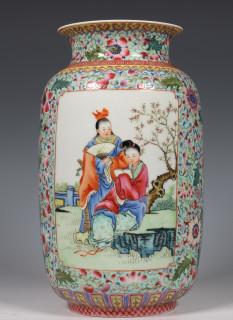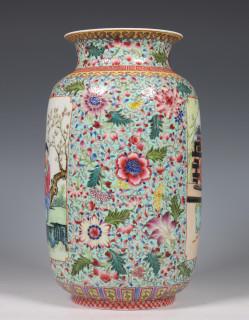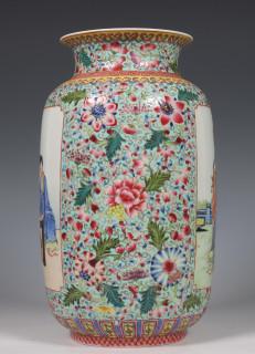China, famille rose porcelain lantern-shaped vase, 20th century, decorated with figural panels on a turquoise ground decorated with flowers, with apocryphal Qianlong mark, provenance: Dutch private collection