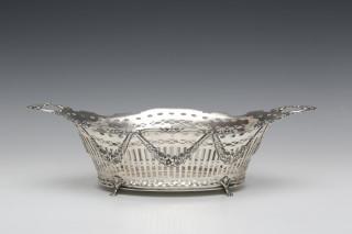 ajour ovaal model met twee voluutvormige versierde grepen en bloemguirlande appliques, staand op vier klauwpootjes, mt. Schoonhovensche Zilverfab. b.v. H. Hooijkaas 1949 Schoonhoven, 2e gehalte,