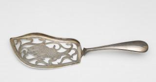 met opengewerkte schepbak voorzien van een vis tussen waterplanten, mt. Fa. Bonebakker Jzn. 1903 Amsterdam, 2e gehalte, deukje,