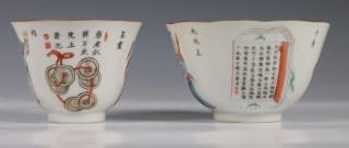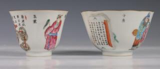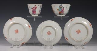 China, famille rose porcelain 'Wu Shuang Pu' cups and saucers, 19th century, comprising two cups and three saucers, decorated with figures and inscriptions from the tale 'Wu Shuang Pu', seal marks, provenance: Dutch private collection
