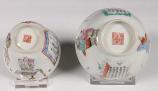 bestaande uit twee kommen en drie schotels, gedecoreerd met figuren en inscripties uit het verhaal 'Wu Shuang Pu', zegelmerken
