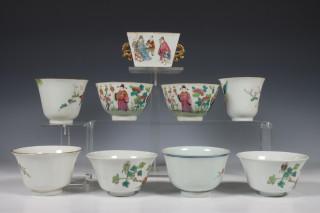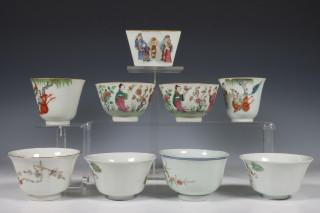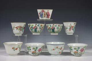 China, collection of famille rose porcelain bowls, 19th-20th century, four variously decorated with figures, four with birds and flowers (chip, hairline), together with a square bowl with turquoise-glazed interior, provenance: Dutch private collection
