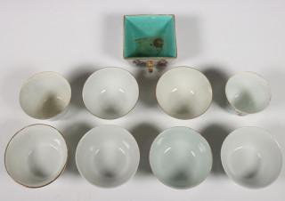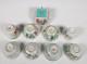 vier verschillend gedecoreerd met figuren, vier met vogels en bloemen, tezamen met een vierkant bakje met turquoise binnenzijde (chip, haarlijn)