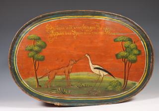 Floraal geschilderd en met voorstelling van een wolf en ooievaar op de deksel en de spreuk: 'Brüder met dein langen kragen, wohl das bein aus meinen klagen'.