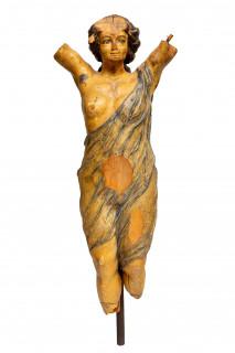 Voorstellende vrouwfiguur met blauwe draperie. (missende delen en beschadigingen).