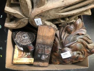 hierbij twee houten leeuwenkop ornamenten, Indiaas specerijendoosje en twee gestoken houten ornamenten.