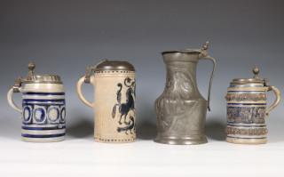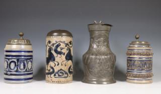 Duitsland, drie steengoed klepkannen en tinnen klepkan, 18e en 19e eeuw