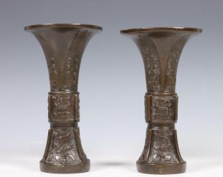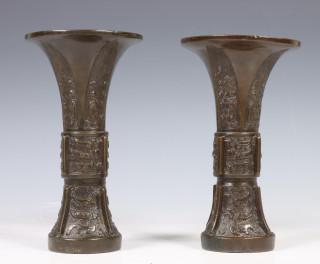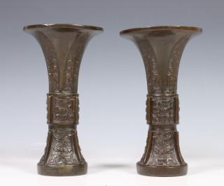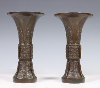 China, pair of archaistic bronze vases, 'gu', 18th century, each modelled with stylised taotie masks and vertical flanges (wear, some dents)