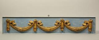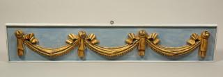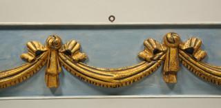 Uitgevoerd met gestoken houten en vergulde decoratie van guirlande op een blauw fond.