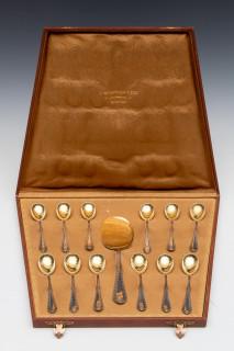 twaalf ijslepels en een opdienlepel, vergulde ovale bakken en uitlopende stelen met gestileerde decoratieve patronen, getekend 830S, niet geïdentificeerd, trapezium vormige bruine gestoffeerde cassette met adres S van Osenbruggen & Zoon 147 Kalverstraat Amsterdam,