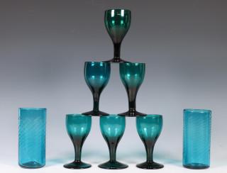 Set van zes groen glazen wijnglazen, Biedermeier, en twee waterglazen