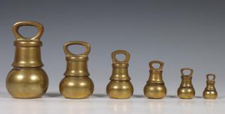 Engeland, set van zes koperen bolvormige gewichten, ca. 1900.