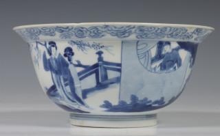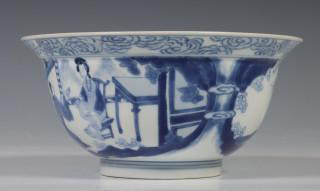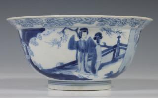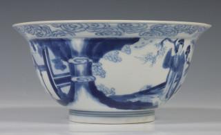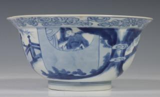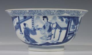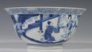 China, blue and white porcelain bowl, Kangxi mark and period, decorated with elegant ladies in pavilion and garden, the interior with boys at play, with six-character Kangxi mark (two hairlines)